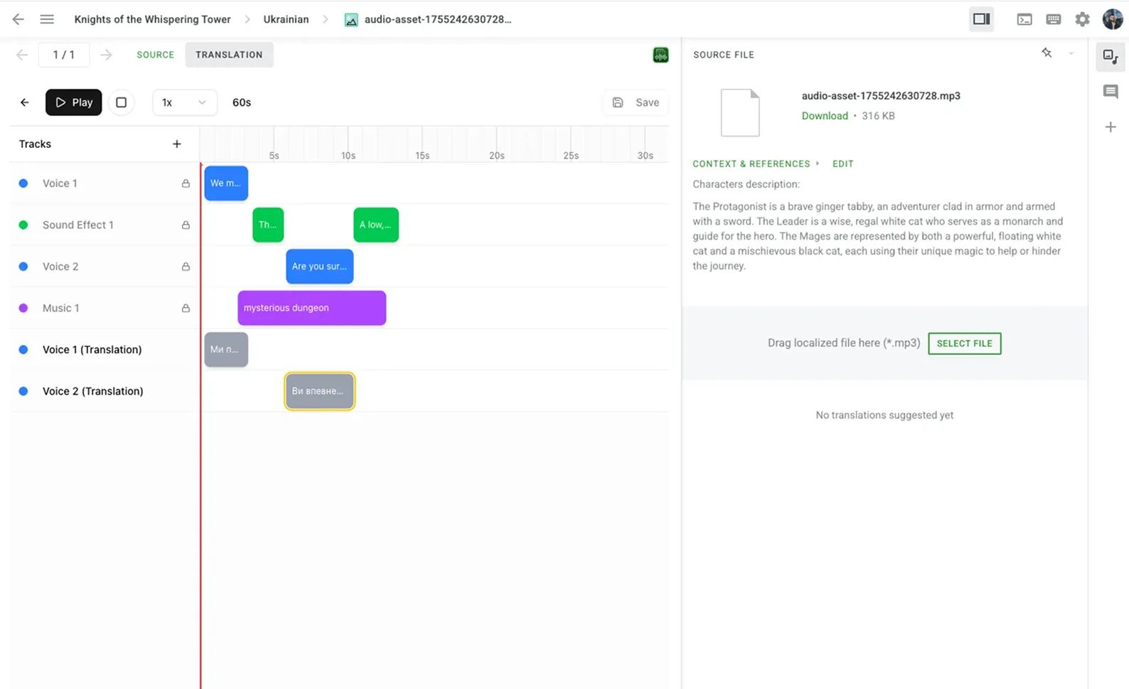 Subtitles are half the battle. Translate UI, menus, inventories, and voice lines in the same workflow.
